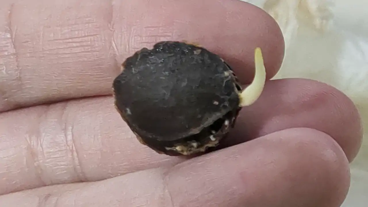 ただ、実際のところ、それをしなくても発芽自体は成功する場合があります。冬を経なくても発芽はします。その方法は、単に種を取得後、種の固い殻を割り、中の茶色い薄皮も、そのさらに内側の白い膜も取り去り、湿らせたキッチンペーパーなどで包んでおくと発芽することがあります。